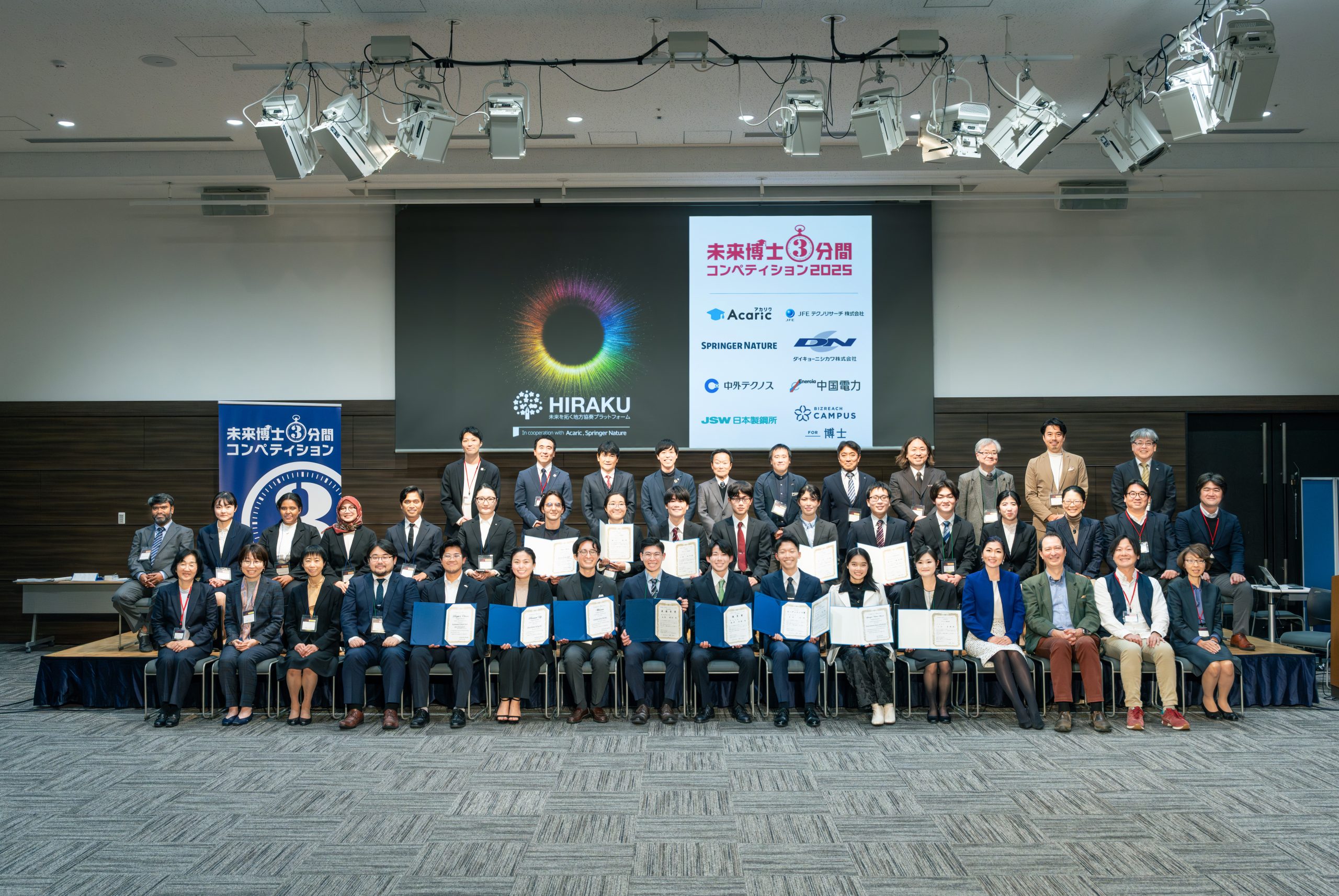 この大会は、広島大学を代表とする「未来を拓く地方協奏プラットフォーム(HIRAKU)」が主催し、博士課程後期の大学院生が、自身の研究の背景やビジョンについて3分間でスライド1枚のみを使って発表するものです。事前の動画審査を通過した日本語部門・英語部門各10名の発表者の中から、産業界・アカデミアからの審査員の審査によって最優秀賞・優秀賞、聴衆の投票によってオーディエンス賞が各部門1名ずつ選ばれます。